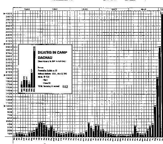 Detta diagram är baserat på de dödsfall som skedde i koncentrationslägret Dachau i Tyskland. Som ni kan se har vi en tyfus-epidemi kring vintern 1940-1941 och en vintern 42-43. Se även att en stor andel av de döda omkom i krigets slutskede, då maten var knapp efter att de allierade hade bombat alla kommunikationslinjer samtidigt som koncentrationslägren i öst hade evakuerats, vilket ledde till en stor överbeläggning i de västliga lägren. Dachau var som känt inget "förintelseläger", även om det var "gaskammaren" i Dachau som användes som bevisunderlag i Nürnberg- rättegångarna. Vad som dock gör detta diagram så intressant är när man jämför med när ordern om jude-utrotningen påstås ha kommit och sedan ordern om ett avbrytande. Den första ordern ska ha kommit sommaren -41 och som ni ser så minskar genast dödsfallen. Den andra ordern sägs ha kommit i November -43 och som ni ser ökar dödsfallen genast! Alltså bör man intaga en viss tveksamhet till de påståenden som nämns om order om utrotning.