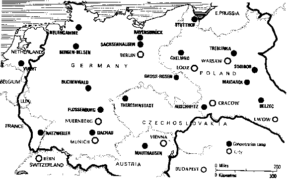 På denna översiktskarta kan man se alla de läger som användes av nazisterna under andra världskriget och där hundratusentals människor hölls inspärrade. I öst kan man se de nazistiska lägren i Polen, som Auschwitz-Birkenau, Treblinka, och Majdanek där man idag påstår att miljoner människor, främst judar, gasades. Västerut, i Tyskland och Österrike kan man se läger som Dachau, Buchenwald och Mauthausen som man efter kriget också påstod var "utrotningsläger" med gaskammare, men där man nu officiellt erkänt att ingen människa någonsin gasats. På kartan finns även Theresienstadt utmärkt, en stad i Tjeckoslovakien, nuvarande Tjeckien, som tyskarna gjorde om till ett mönsterghetto för framförallt äldre och bemärkta judar.