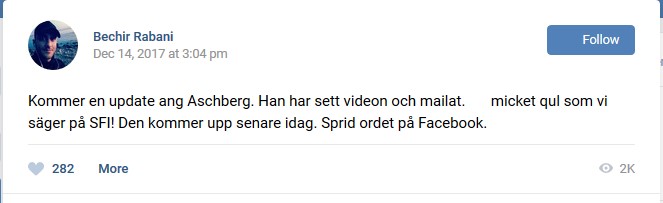 "Efter mitt besök hos Aschberg så stängdes mina facebook-konton ner permanent. Detta har aldrig någonsin hänt tidigare. Samt att texten nedan om reportaget raderades överallt på facebook. [...] De har redan provat att släcka ner mig genom att försöka stämpla mig som ”högerextrem, böghatare, islamofob och judehatare”, det gick inte så bra. Denna gången är jag säker på att de kommer koka ihop någonting som ska sätta mig på plats och som ska skrämma iväg mina följare."- Den hycklande kurdens återkomst