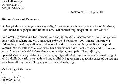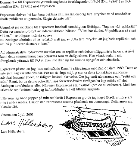 "Utan att fråga använde man sig av bandspelare och trots det förfalskar men citat. Dessutom förvägras intervjuoffret att se ett korrektur och i stället stympar man intervjun godtyckligt så att sammanhang och mening förrycks.Det är inte journalistik i vedertagen mening man då använder sig, av utan smutskastning i bästa Der Stürmer-stil. Flera - inte bara Lars Hillersberg och Per Gahrton - har tidigare upplevt detta."