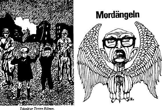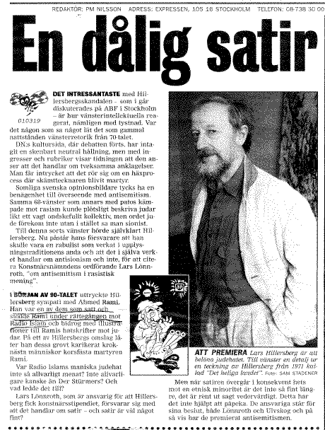 Lite historik: 1967 gjorde jag en teckning som föreställde Moshe Dayan. När Per Ahlmark såg den brast något inom honom och han beskyllde mig offentlig för antisemitism. Jag borde kanske polisanmält honom, men jag har aldrig kunnat ta Ahlmark på allvar.1968 ritade Lena Svedberg en karikatyr på dåvarande riksbankschefen Krister Wickman. Den sades vara antisemitisk för att Wickman på något sätt såg judisk ut. Vi förstod ingenting. Varför i fridens namn skulle Lena framställa Wickman som jude? Hade Wickman en judisk morsa eller något i den stilen? Vi tyckte inte Wickman såg judisk ut vare sig på bild eller i verkligheten. Spritnoja i sista stadiet, konstaterade vi rått.