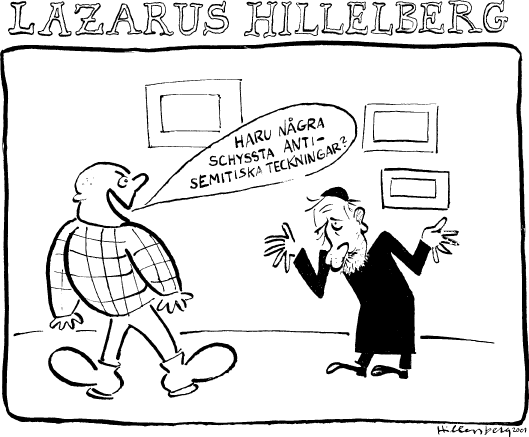 Lena Svedberg och jag är ju inte de enda konstnärerna som drabbats av beskyllningar för antisemitism. Jag är heller inte den förste som karakteriserat manin att antisemitstämpla mängder av svenska kulturarbetare som en verksamhet på dårnivå. Den danske tecknaren Albrechtsen, EVK, Gunnar Thorén, DN-tecknaren Ehrling och nu senast Dagens Industris tecknare Gideon med flera har också drabbats. Oftast då för att dessa på något sätt dragit paralleller mellan den nazistiska judeförföljelsen och de israeliska grymheterna mot palestinierna. Det är i och för sig sant att förintelsen är unik, inte bara i omfattning - men en politisk satir arbetar just med sådana belysande (omöjliga) jämförelser. En aforism i bild kan aldrig vara heltäckande. Problemet är snarare att sammanställningen nu blivit lite banal. En som inte bekymrar sig över sådana subtiliteter är redaktören för Judisk Krönika som gladeligt sätter in en bild föreställande Jan Bergman tillsammans med en föreställande Goebbels.