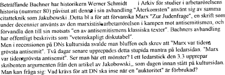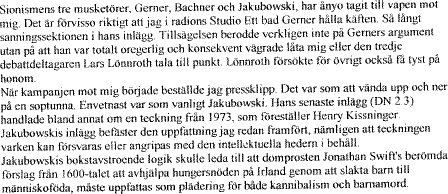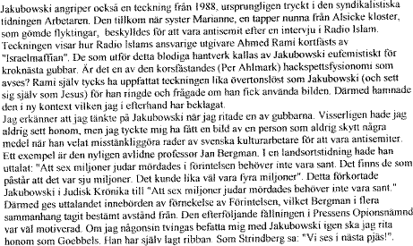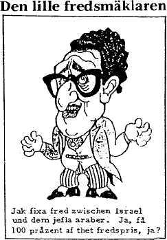 En av de teckningar som oftast åberopats i den senaste kampanjen är från 1973. Den föreställde Henry Kissinger och hade titeln "Den lille fredsmäklaren". Denna teckning är så parodiskt antisemitisk (i samma tradition som Lenny Bruce, Mel Brooks och Woody Allen) att den i oförfalskad form nog skulle bli svår att använda i rasistisk agitation. Vem skulle gå på så grova krokar? Naturligtvis kan man inte försvara en sådan teckning. Man borde inte kunna angripa den heller, med den intellektuella hedern i behåll. När den i slutet på 80-talet publicerades i Judisk Krönika var titeln ändrad till "Den lille judemäklaren". Smaklöst naturligtvis, men framför alllt så urbota dumt. Jakubowski har senare förklarat att detta berodde på min slarviga handstil. Säkert - men betänk den mentalitet som gör en sådan felläsning möjlig!