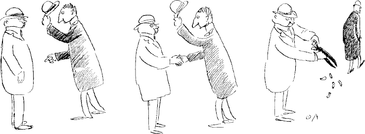 Det är självfallet bra att vaksamheten mot antisemitism och rasism nogsamt upprätthålls. Ibland kan det dock få paranoidkomiska övertoner. Som t ex när en skribent i DN här om året tyckte sig se antisemitism i OA:s serie "Mannen som gör vad som faller honom in". Bilderna visar hur en långnäst herre tränger sig fram och trycker seriens huvudpersons hand, vilket får Mannen att i nästa bild klippa av sig sina fingrar. Nu är ju stora luktorgan inget nytt i skämtteckningens historia och denne långnäste herre var inte ett dugg jude. Han kallades Tapiren, hette till yttermera visso Kristiansson och hade motsatt sig OA:s inträde i Publicistklubben.