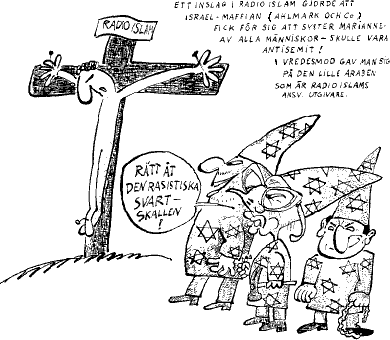 Den tjugonde december hade nyheten att jag erhållit statlig inkomstgaranti nått medierna. Klockan 8 på morgonen var jag instämd till TV4-soffan och fick svara på Kristian Gerners hatiska beskyllningar. Han hade hittat två teckningar som han tyckte var antisemitiska. Den ena, från slutet av 70-talet, föreställde Israels premiärminister Begin ridande på en bomb märkt "Made in USA", den andra Israels nästa premiärminister, Shamir, som försöker få en motsträvig svensk dalahäst att hoppa genom davidsstjärnan. Enkla politiska teckningar som skulle kunna stå på de flesta svenska tidningars ledarsida (inte Expressens förstås). Faktum är att den förra ursprungligen publicerades i Dagens Nyheter.
