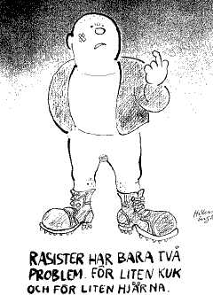 I början på 90-talet var man på Aftonbladets kulturredaktion bekymrad över den alltmer ökande rasismen. Man beslöt att ge ut en antirasistisk bilaga och kontaktade ett antal medarbetare. Själv bidrog jag med en teckning som avhånade en skinnskalle. Jag torde för övrigt vara den svenska tecknare som ritat mest mot rasismen och har också ägnat ett specialnummer av min tidning GATSKRIKAN åt att bekämpa den. Till den verkan det nu kunde ha. Jag har också gjort flera raka bilder där jag tagit parti för judar. Bland annat när judiska kyrkogårdar skändats och vid avslöjandet att schweiziska och amerikanska banker roffat åt sig judiska konton och tillgångar. När denna Aftonbladets antirasistiska bilaga kom ut skrev Henrik Bachner i DN och utdömde den som rasistisk! Detta - visade det sig - för att Jan Myrdal och jag medarbetade. Enbart vår medverkan förvandlade alltså en antirasistisk pamflett till en rasistisk. Nå, Bachner kände jag till sedan förut, men hur kom det sig att DN överhuvudtaget tog in det flummet? Jag frågade och fick då svaret att Aftonbladet ju hade refuserat inlägget(!). Jag tillät mig att något driva med Bachner. Grymt kanske, mot en person med uppenbara läs-och skrivsvårigheter. Jag frågade om vi skulle beläggas med yrkesförbud. Och vad skulle Myrdal göra?Efteråt har jag insett att jag varit lättsinnig.