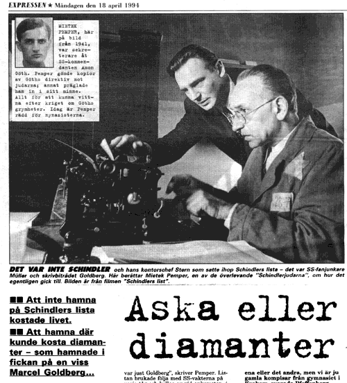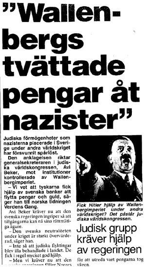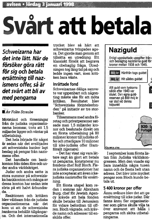 Avisen, 3/1-1998. Avisen beskriver hur utbetalningarna till "förintelsens offer" fördröjdes eftersom judarna inte ville dela pengarna med några andra. Dessutom kunde man inte hitta några offer att dela ut pengarna till.