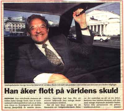 En annan aktör som idel hyllas och citeras i den judisk-kontrollerade pressen är den judiske finansspekulanten George Soros, mannen som har ett stort ansvarig för det ekonomiska elände som drabbade Europa och Sverige under 1990-talet. De senaste beräkningarna har visat att hans kampanj 1992 mot den svenska kronan och andra europeiska staters valutor kostade oss samhällsekonomiskt så mycket som upp till 95 miljarder kronor, som ett resultat av att den svenska riksbankens misslyckade försvar av kronans kurs. Soros har alltså ett stort ansvar för den s.k. krisen i Sverige och priset vi sedan fick betala med försämrad sjukvård, skolgång, och utbredd massarbetslöshet.