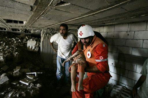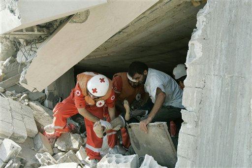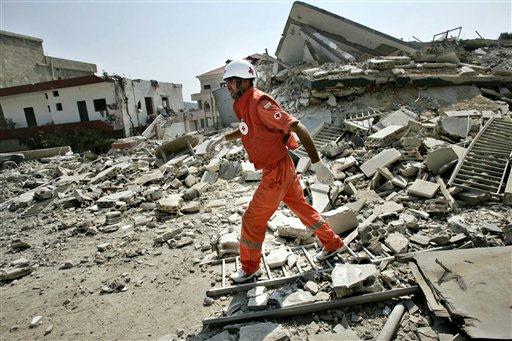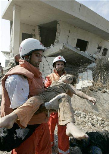 A Lebanese Red Cross volunteer rushes to the rubble of a