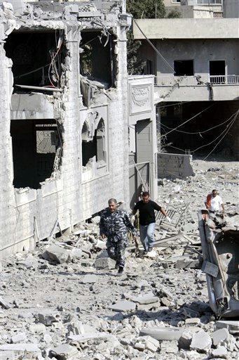 Lebanese Civil Defence officers run past a mosque destroyed in