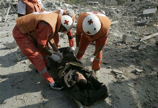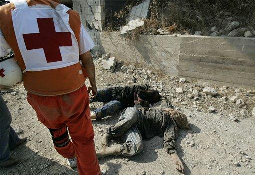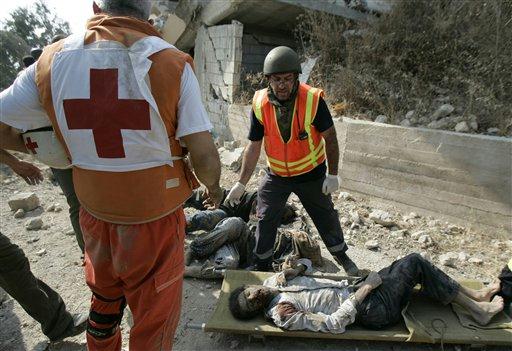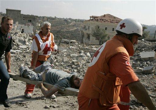 Lebanese Red Cross volunteers carry a blanket with the bodies of