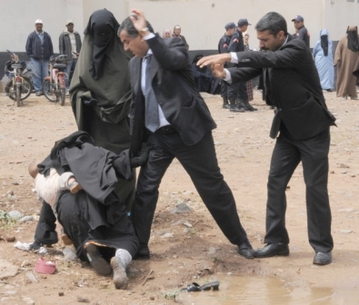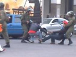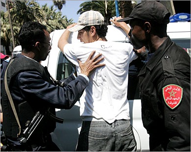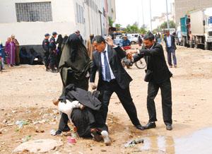 عميد شرطة "مغربي" يقوم بضرب فـتـيـحـة الحداد وابنها الرضيع بلال خلال وقفة تضامنية نضمتها نساء المعتقلين الإسلاميين  أمام سجن عكاشة بالدار البيضاء يوم الثلاثاء 27-5-2008