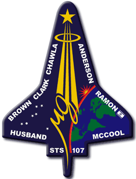 A droite, on note un lever de soleil sur une mappemonde où n'apparaissent que l'Amérique, l'Europe et le continent Africain. Un seul drapeau, celui d'Israël, est accolé à RAMON, le nom du passager juif de même nationalité. Si le nombre 107 indique celui de la mission, il s'agissait pourtant de la 113e de la navette dans la réalité. 107 et 113 sont respectivement les 28 et 30e nombres premiers. Les sept rayons du soleil rappellent les sept pointes de la couronne juive de la "statue de la Liberté" avec sa torche Luciférienne régnant sur les sept continents. Ce logo nous montre donc une étoile jaune à atteindre, alors qu'un drapeau Israélien est accolé au nom RAMON, le passager Juif de la navette. Ce juif Israélien était un "héros" dans en Israël parce qu'il avait détruit la centrale nucléaire "OSIRAK", contraction d'Osiris et d'Irak, un pays musulman qui ne devait pas avoir le même droit que l'état d'occupation juif ! Les plus grandes vérités sont présentées comme des fictions en pâture au public qui n'aura même pas conscience que le monde s'est transformé en un vaste théâtre où l'illusion est alimentée par les médias sachant que la télévision y tient un rôle prépondérant. L'un des logos de la