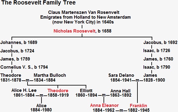 Elena Roosevelt, was the niece of Theodore Roosevelt, and married her distant relation Franklin in 1905. Her uncle Theodore gave her away at the wedding ceremony, as her father, Theodore's younger brother Elliot, had died 11 years previous.