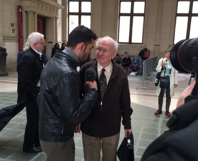Prof. Faurisson 2016 in einem Pariser Gerichtsgebäude. Medienhetzer interviewen ihn bei einem der fast schon unzähligen gegen ihn inszenierten Terrorprozesse.