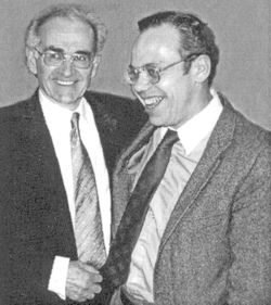 Prof. Faurisson (li) und Ing. Fred Leuchter 1989. Fred Leuchter war Konstrukteur für amerikanische Hinrichtungsanlagen. Er konstruierte u.a. Blausäure-Gaskammern für den gesamten Hinrichtungsbetrieb in vielen amerikanischen Gefängnissen. Blausäure wurde insbesondere unter der deutschen Handelsbezeichnung "Zyklon B" bekannt, die im Krieg zur Entwesung von Kleidung gebraucht wurde. Fred Leuchter erstellte 1988 ein Gutachten über die "Gaskammern" von Auschwitz, Birkenau und Maidanek.