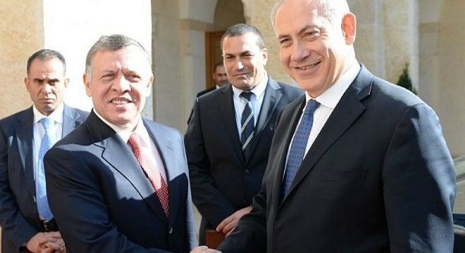 King Abdullah II smiling with Benjamin Netanyahu, hater of Arabs and Prime Minister of Israel.