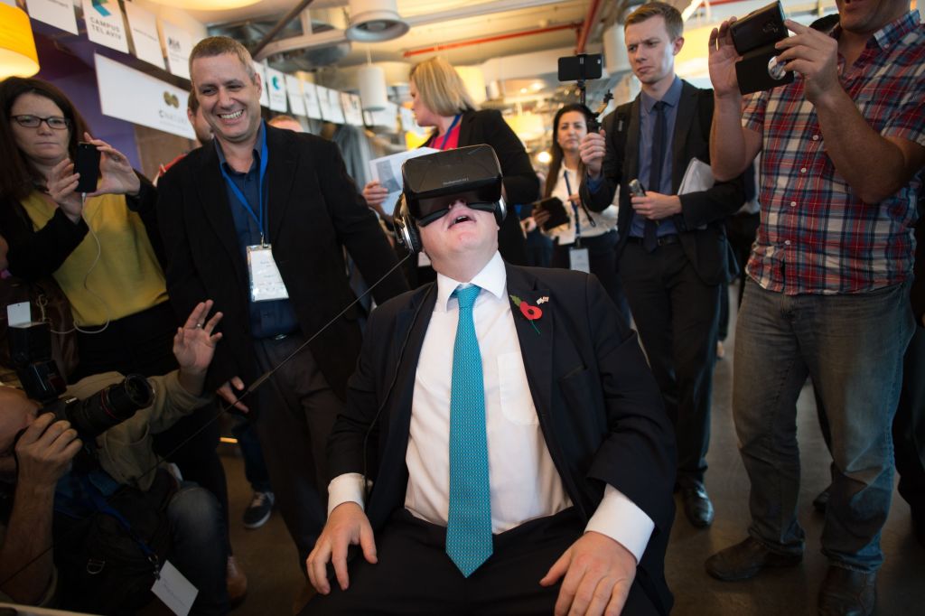 Ex-Mayor of London Boris Johnson tries on an Oculus virtual reality headset at Google’s offices in Tel Aviv, Israel, at the start of a four day trade