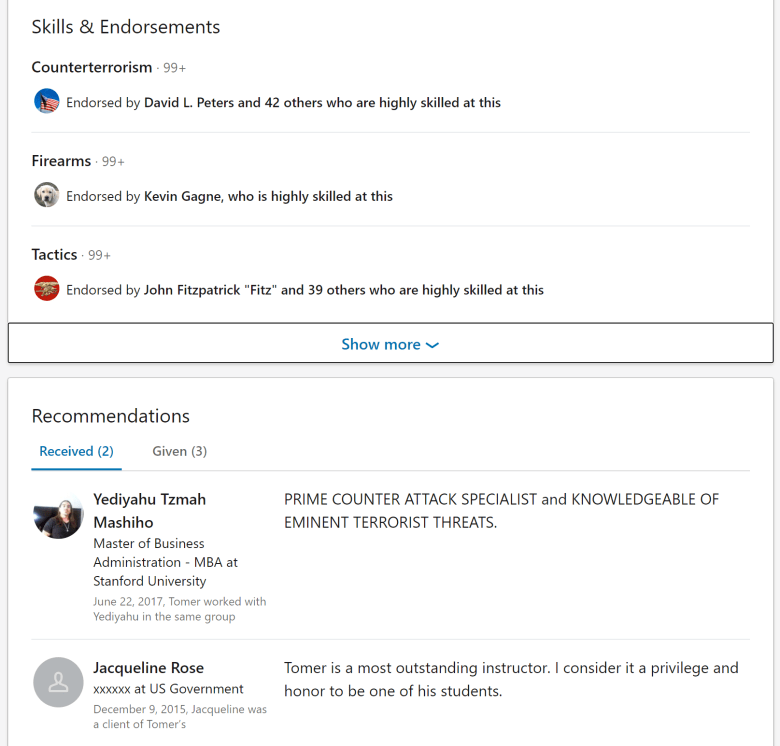 If his claimed background is genuine, as his significant list of professional endorsements by other Linkedin users suggests, he would appear to be in a position to know what “the curriculum of Israeli security forces and special units” entails.