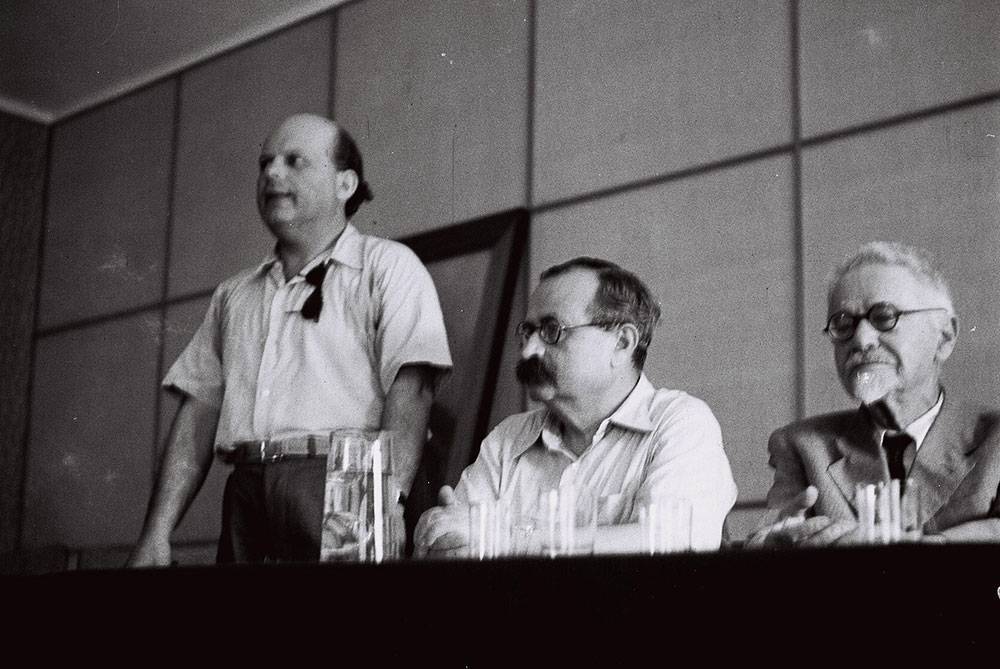 Nahum Slouschz (right) with S. Shalom (standing) and Asher Barash (center), 1948.