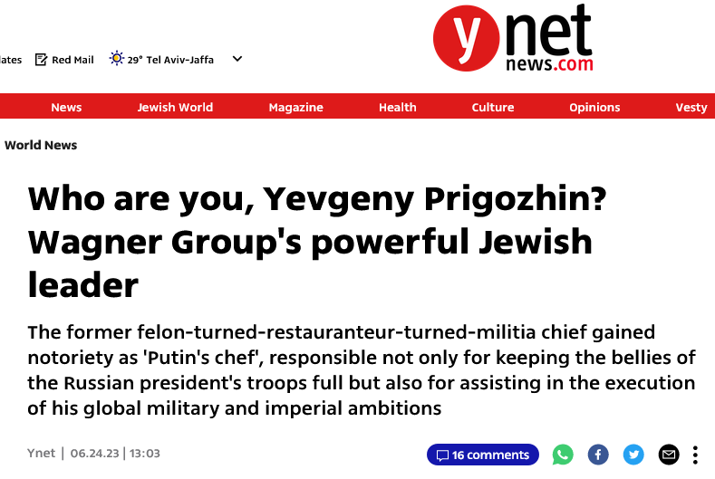 In June 2023 Israeli news was even more frank, designating Prigozhin as a "powerful Jewish leader":