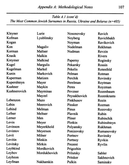 page 107, under the headline: "The Most Common Jewish Surnames in Russia, Ukraine and Belarus"