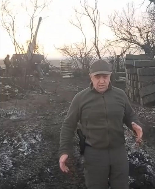 Yevgeny Prigozhin, pistol in belt, at the frontline in the Russia-Ukraine War, December 2022.