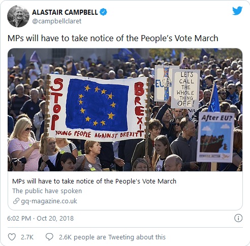 Well, over 1 MILLION people (myself included), did march through central London on February 15, 2003, calling on the UK government not to attack Iraq. But Campbell, then spin doctor to the pro-war MP Tony Blair, did not want MPs to take notice of that – and they didn’t, despite it being the largest ever political demonstration in British history. Why does he think some protestors should be listened to but others-who take to the streets in much greater numbers, should be ignored? Why didn’t he want us to have a ‘People’s Vote’ on invading Iraq?@campbellclaret You went ahead with the Iraq War, which no one voted for in the first place, despite 2 million people marching against it. But you think 100,000 people marching today should overturn the votes of 17.1 million? #PeoplesMarch#PeoplesVoteMarch