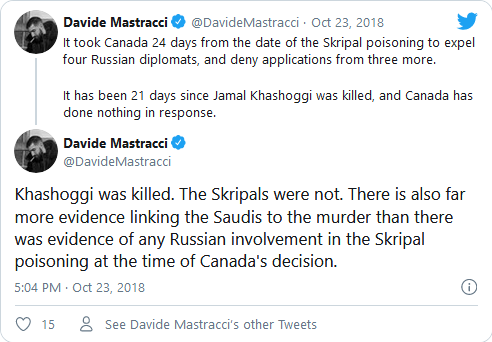 And that great human rights respecting liberal, Justin Trudeau, says he is unlikely to cancel Canada’s $12bn sale of armored vehicles to Saudi Arabia because it’s a “difficult contract”. Canada expelled four Russian diplomats over the Skripal case, when no one had died, but none yet over Khashoggi.READ MORE: Canada is 'concerned' with Khashoggi's fate but will sell arms to Saudis anyway – Trudeau