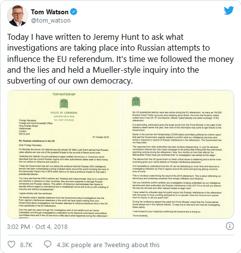 But we’re not really meant to talk about it, as it’s an ‘ok’ country – who’s doing the meddling. There have been no expulsions. No sanctions. Instead we have staunch ‘Friends of Israel’ like Tom Watson MP, calling for a ‘Mueller-style investigation’ into the 'subverting' of British democracy, by... you've guessed it –Russia!