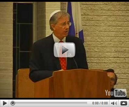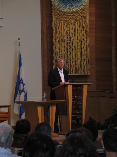 Dennis Ross speaks at Congregation of Reform Judaism in Orlando, FL, on 10-19-2008, the Israeli flag handy in place behind him.