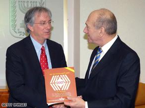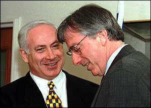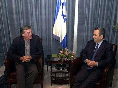 Dennis Ross seated with Israeli Labourist Ehud Barak, Israeli flag in place as usual.