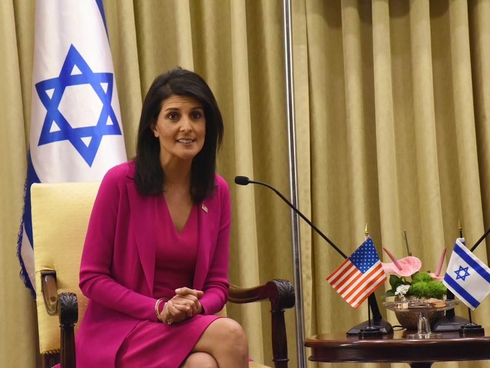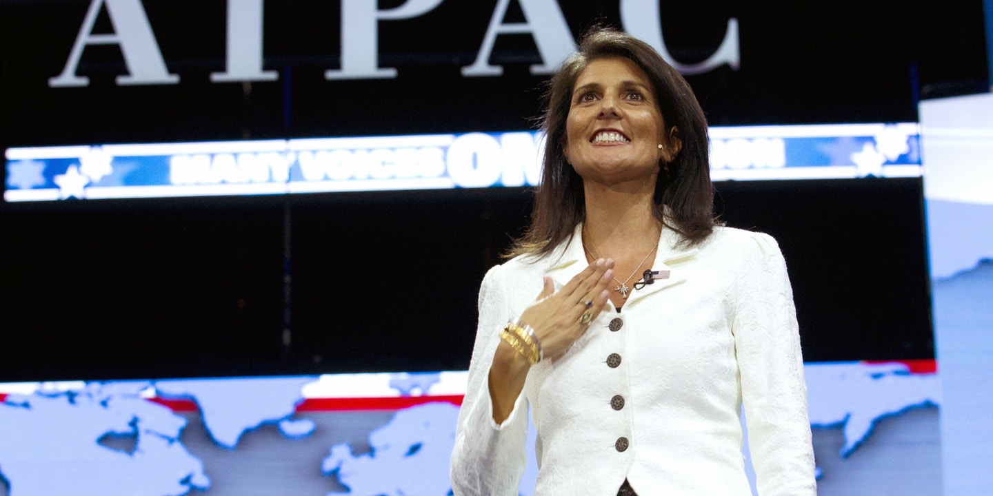 Nikki Haley writing "Finish Them" on Israeli bomb destined to hit the Palestinians of Gaza.