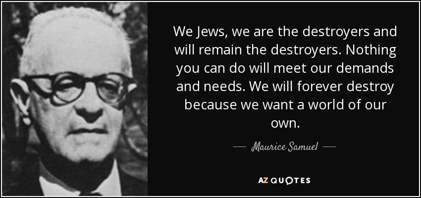 “We Jews, we, the destroyers, will remain the destroyers for ever. Nothing that you do will meet our needs and demands. We will for ever destroy because we need a world of our own, a God-world, which it is not in your nature to build. Beyond all temporary alliances with this or that faction lies the ultimate split in nature and destiny, the enmity between the Game and God. But those of us who fail to understand that truth will always be found in alliance with your rebellious factions, until disillusionment comes. The wretched fate which scattered us through your midst has thrust this unwelcome rôle upon us.” (p. 155)