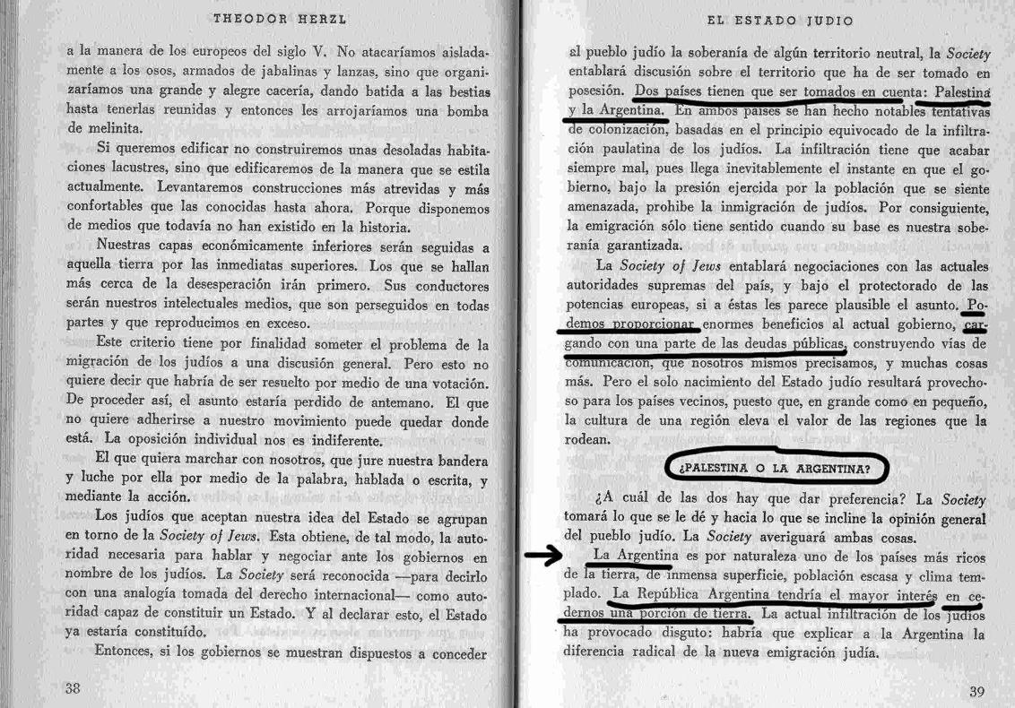 “...dos países tienen que ser tomados en cuenta: Palestina y Argentina (pág. 39), llegando inclusive a considerar: “...cargar una parte de las deudas publicas...” del estado cuyo territorio se colonizará. (pág. 39)