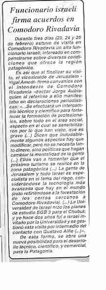 Es así que al finalizar su visita, el vicealcalde de Jerusalem, -Yigal Amedi- firmó convenios con el intendente de Comodoro Rivadavia -doctor Jorge Aubía- quien al referirse a ello manifestaba en declaraciones periodísticas: