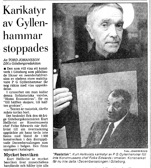 Den icke-judiske konstnären Kurt Hellqvist gjorde en satirisk tavla som avbildade "Kungen av Göteborg", juden Pehr Gylllenhammar, i sämre dager i egenskap av "Homo Economicus". Genast agerade maffian mot Hellqvist och utställningsansvarige Folke Edwards lyfte ut tavlan från Göteborg konstmuseums Decembersalong med hänvisning till att tavlan och texten invid skulle vara "rasistisk".Det intressanta är att KRO, Konstnärernas Riksorganisation, i denna fråga stödde Edwards censuringripande. Enligt en notis i GT-Idag, 18/12-1992, sade KRO i ett principuttalande: "KRO kan självklart inte stödja personer som utnyttjar konstnärsskapets rätt till fritt utryck som täckmantel för rasistisk propaganda eller främlingsfientlighet"