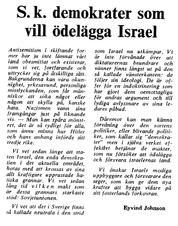 Således kunde man se gamla välkända anti-araber och pro-israeliska chauvinister (och de facto fascister) som Knut Ahnlund, Johannes Edfeldt, Gunnel Vallquist, Lars Gyllensten, Ulf Linde och Torgny Segerstedt - samtliga från Svenska Akademien - som några av undertecknarna av den långa lista från 1985 där man ville att FN:s resolution från 1975 om att sionism är en form av rasism skulle annulleras. En lista som tillkommit på initiativ av World Zionist Organization, detta enligt den judiska källan Judisk Krönika (se artikeln från Judisk Krönika, nr.2-1987).