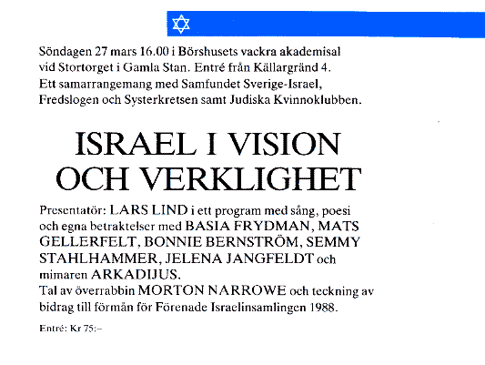 Och när man skall fira den s.k. "Israelfestivalen" för år 1988 höll man den 27/3-1988 en festlighet i Svenska Akademiens festsal i Börshuset (Stortorget i Stockholm) där rubriken för programmet var "Israel som vision och verklighet" (se Förenade Israelinsamlingens tidskrift Menorah, nr.1-1988, se också annonsen invid).