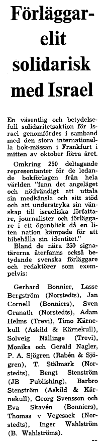 Rubrik och artikel tagna direkt från Förenade Israelinsamlingens tidskrift Menorah, nr.1-1974, sid. 59.En större del av Sveriges förläggarkår avslöjar sig här som sionister - människor som aktivt stödjer ockupationsmakten Israel.