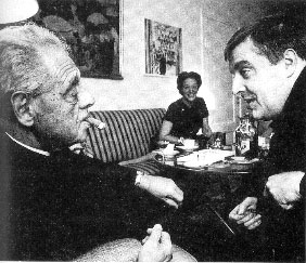 Ulf Linde (till höger) i djup diskussion med sin judiske vän Tor Bonnier (till vänster) hemma hos Bonniers på Manilla.