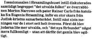 DN, 22/12-1995. Den judiske överrabbinen Morton Narrowe anser att judarna är "lite mer utvalda", lite mer ett herrefolk.***