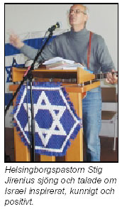 Moderat kyrkopolitikern Ingegerd Troedsson på podiet, stödd av Israels fana - "huvudtalare vid firandet av Israels 40-årsdag":"Det var inte det rätta tillfället för recensioner av dagspolitiken ansåg hon."D.v.s. man skall inte ta upp det judiska apartheidsystemet och dess förtryck av Palestinas ursprungsbefolkning - de kristna och muslimska palestinierna.
