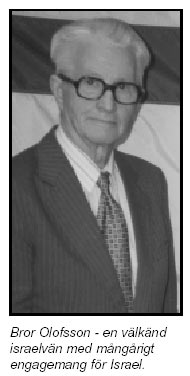Bild och bildtext t.h. från tidskriften "Israels Vän", nr.1-2002.Bror Olofsson - på bilden med Israels fana bakom sig - är precis som bildtexten t.h. medger "en välkänd israelvän med mångårigt engagemang för Israel". Bror Olofsson är verksam inom organisationen Israels Vänner och ansvarig utgivare för dess tidskrift "Israels Vän".