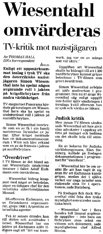 ![]() DN 10/2-1996. En tysk dokumentär avslöjar den judiske bedragaren Simon "vessel-talaren" Wiesenthal. I dokumentären beskrivs hur han ljugit om sin bakgrund och utnyttjat andras arbete för att förbättra sitt eget rykte. |