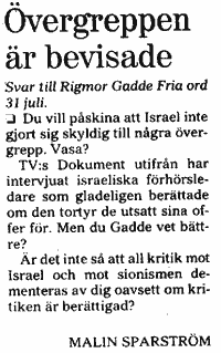 Judinnan Julianna Srebro, från den fejkat Israelkritiska organisationen JIPF, Judar för Israelisk-Palestinsk Fred. Srebro berättade i en intervju i TV4:as Nyheterna, sändningen kl. 18.30, 30/3-2002: