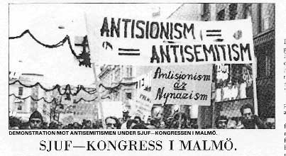 Bild från Judisk Krönika, nr.1-1984, som visar hur judiska ungdomar från den officiella judiska organisationen SJUF - Skandinaviska Judiska Ungdoms Förbundet - demonstrerar i Malmö bl.a. under parollerna "antisionism = antisemitism" och "antisionism är nynazism". Observera att dagens och framtidens judiska ledare i Sverige börjar sin aktivism i och rekryteras från just SJUF.