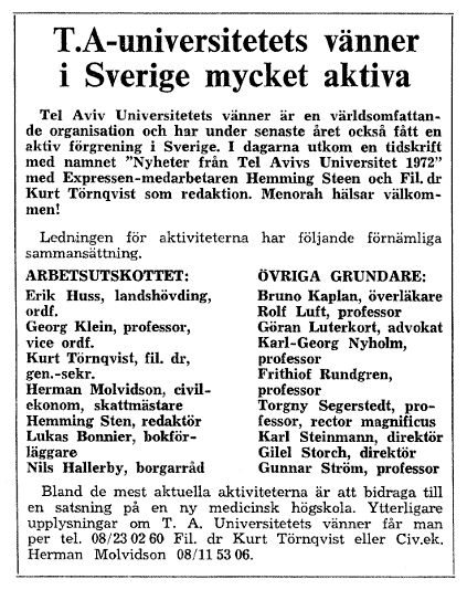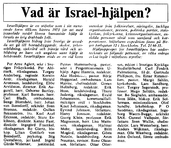 Anders Wijkman, då moderat riksdagsledamot, satt som ordförande för Israel-hjälpens arbetsutskott (se Menorah, nr.4-1975).