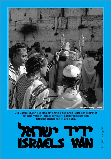 Omslag till tidskriften "Israels Vän", nr. 2-2002.Notera att man hänger sig åt judendomen och judisk symbolik, i detta fall med kalottbärande judar och den för judendomen så centrala "klagomuren" i Jerusalem. Man skriver här också: