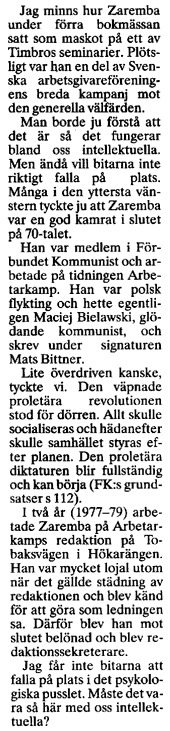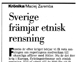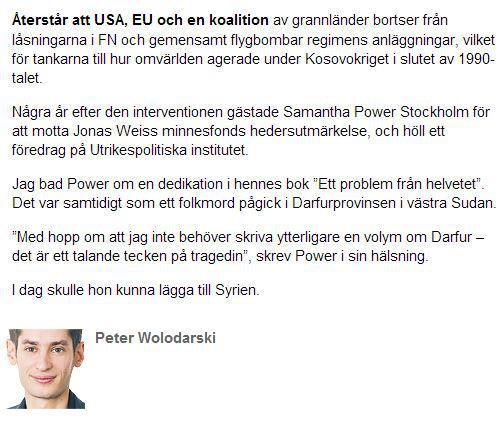 "För att möjliggöra den här politiken krävs nu inte bara att man persionifierar fienden till "Saddam". Det krävs också ett avmänskligande av araber. Offren är inte människor som vi andra.Ty inte skulle Svenska Dagbladets och Dagens Nyheters ledarsidor drömma om att kräva en miljon vita människors död av ditt eller datt politiska skäl. Massmord i vår tid kan bara försvaras av sådana ledarskribenter om offren är araber."